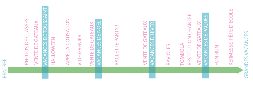 Actions menées depuis sa création : vente de fromage, de ravioles, de photos de classe, vide-greniers, course Fun Run...